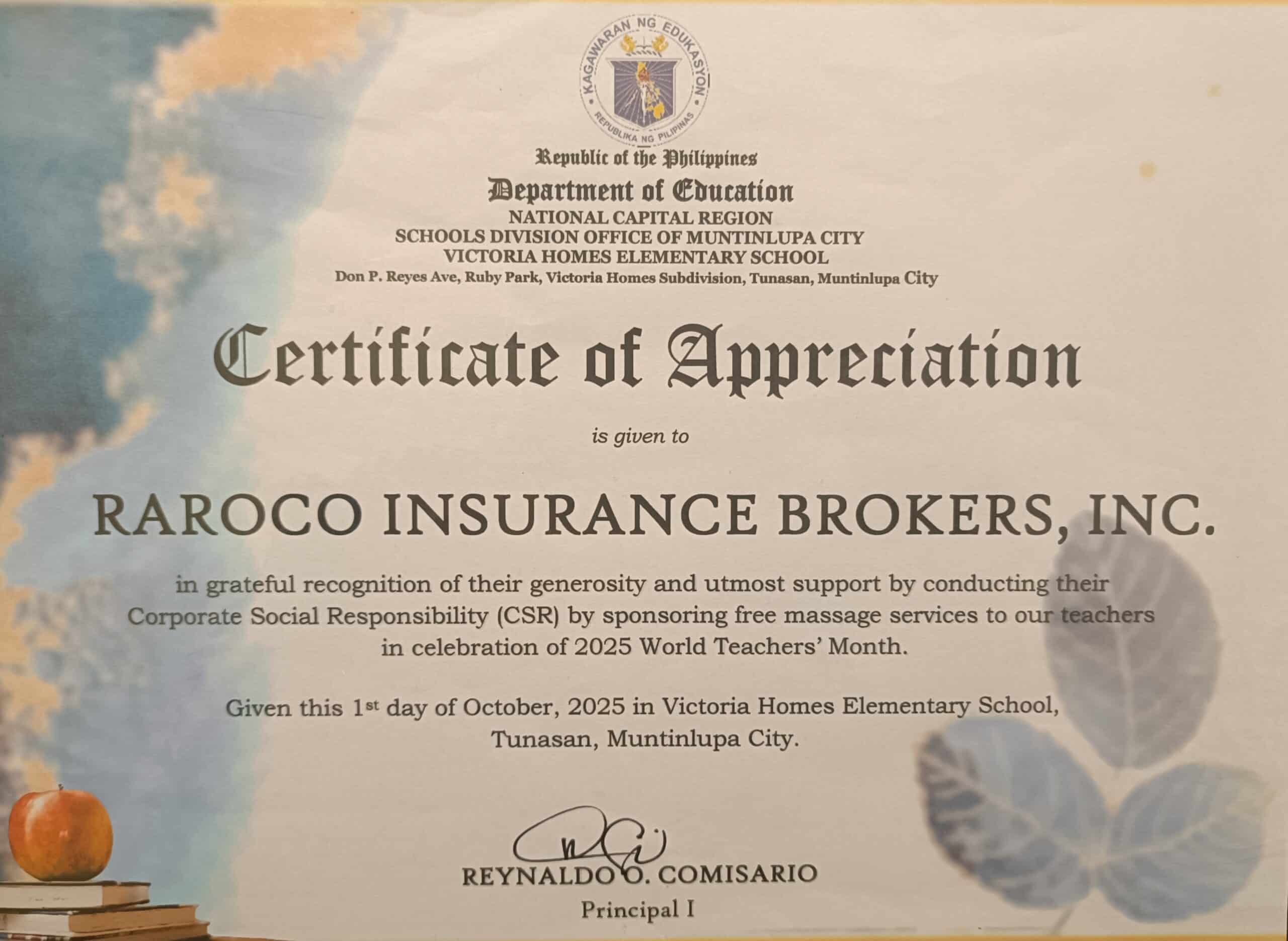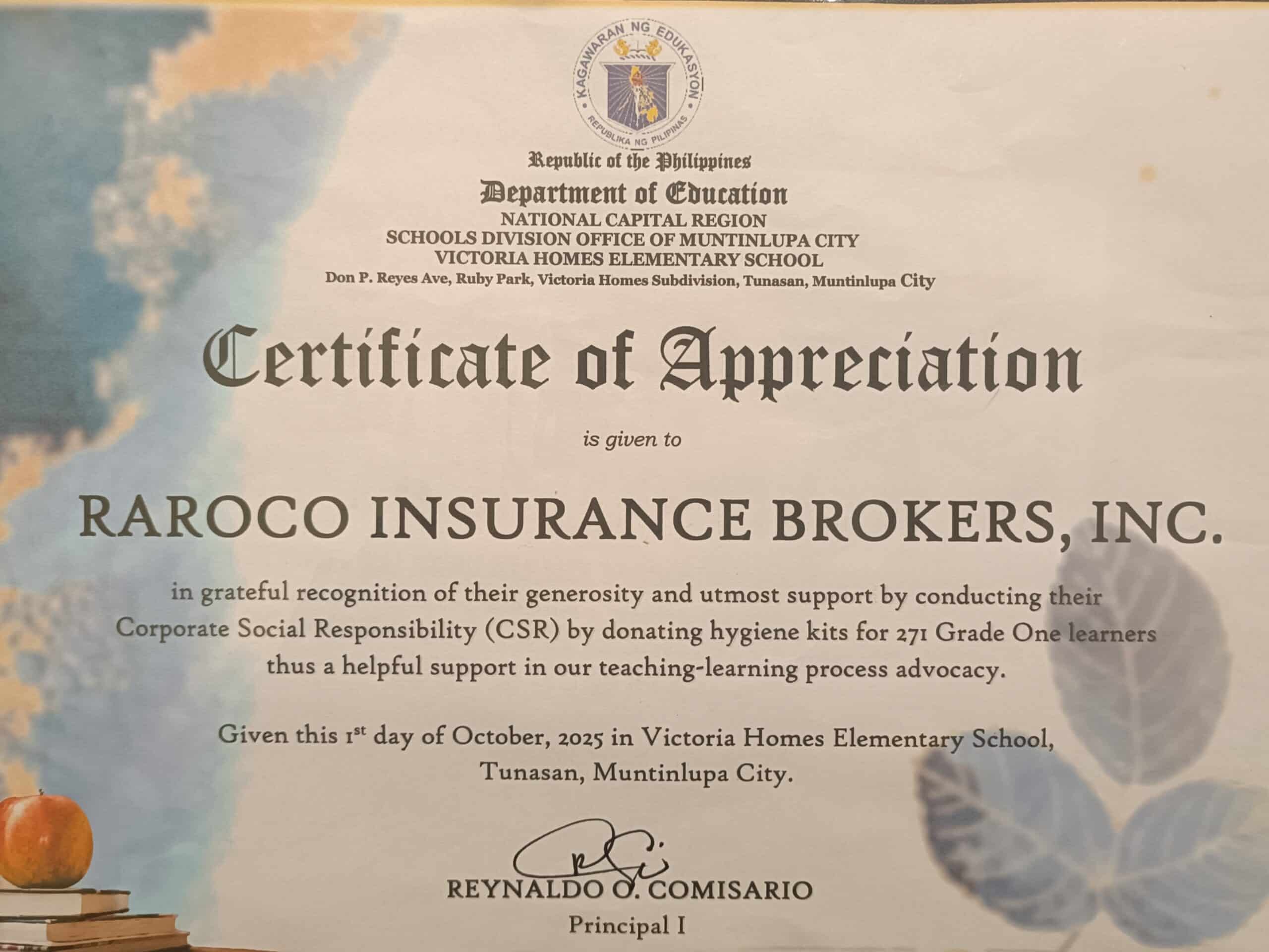In celebration of World Teachers’ Month 2025, RAROCO Insurance Brokers Inc. proudly extended its support to Victoria Homes Elementary School through its CSR program.